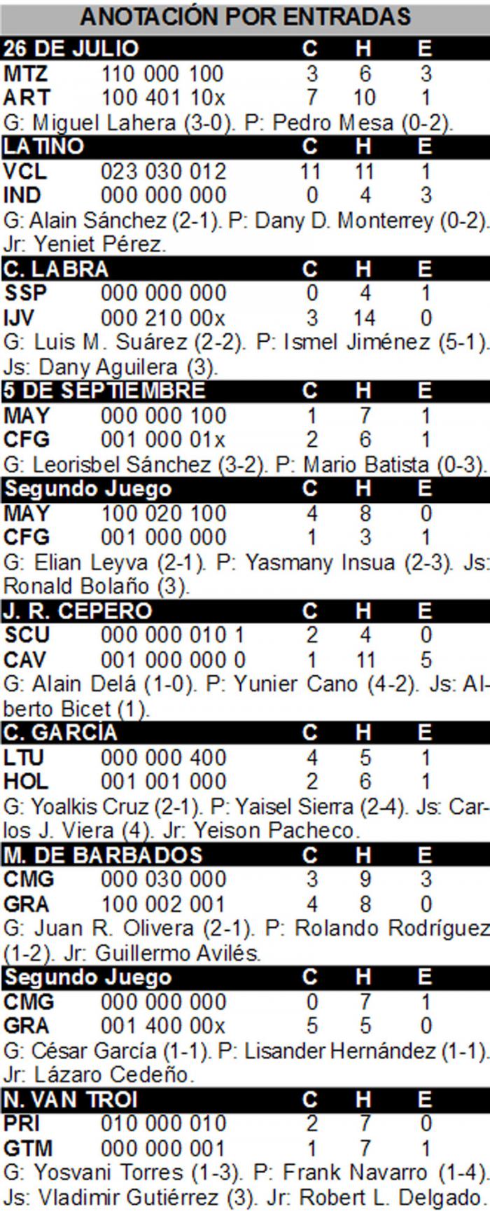 Mientras, en Granma los Alazanes salieron airosos por partida doble luego de someter con pizarras de 5-0 y 4-3 a la tropa de Camagüey, en el segundo caso dejándola al campo.