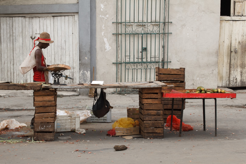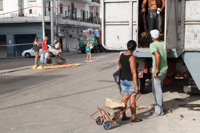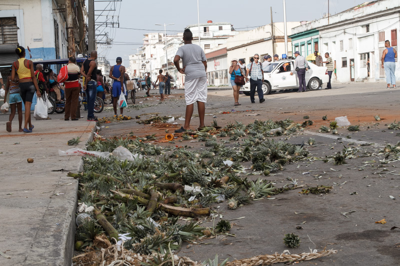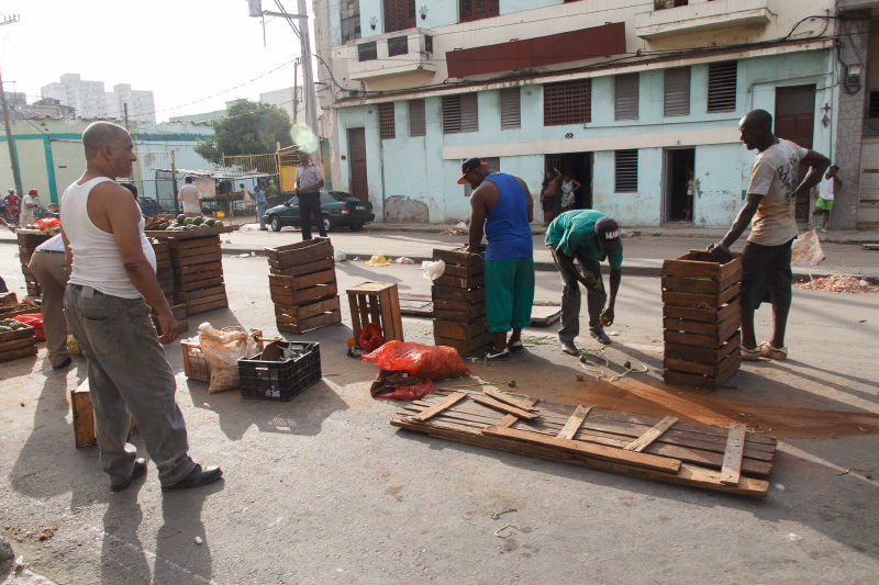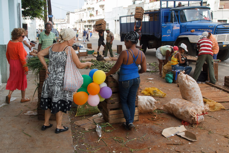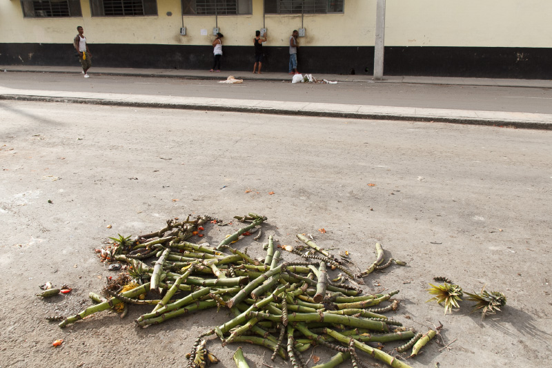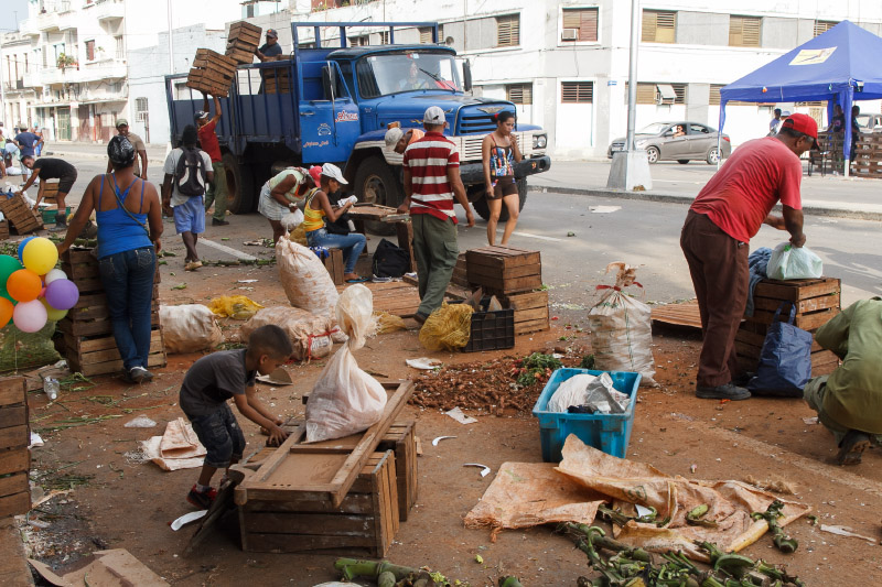 Así es esta feria cubana, como el pan y el circo, como un surco de campo en medio de la ciudad. Se me ocurrió este sábado ya en la tarde tomar algunas instantáneas de este pedazo improvisado cuando casi todos vendían las últimas mercancías y recogían lo poco que quedaba para terminar dejando estelas de maíz y piña, troncos de plátanos, pedazos de yuca, malanga y una tierra colorada con cajitas de comida vacías en las puertas de los vecinos asombrados de tanto reguero.