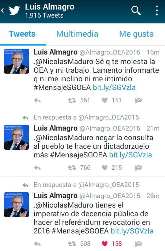 “Que nadie cometa el desatino de dar un golpe de Estado en tu contra, pero que tú tampoco lo des. Es tu deber. Tú tienes un imperativo de decencia pública de hacer el referéndum revocatorio en este 2016, porque cuando la política está polarizada la decisión debe volver al pueblo, eso es lo que tu Constitución dice”, sostiene Almagro en su declaración, publicada hoy en la página web de la OEA.