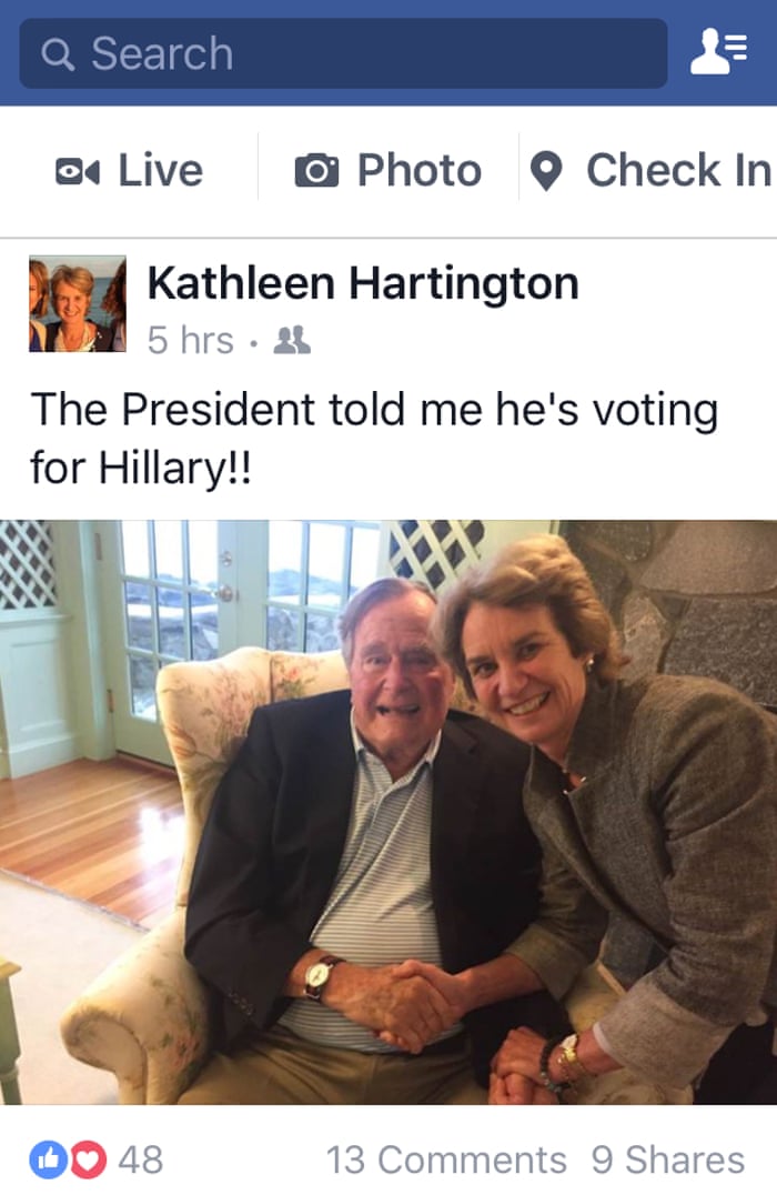 La exvicegobernadora de Maryland e hija de Robert F. Kennedy, publicó en su facebook una imagen con el patriarca de los Bush dándole la mano, junto a un pie de foto que reza: “¡El presidente me dijo que va a votar por Hillary!”.