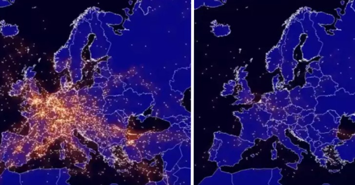 El registro muestra el «número de vuelos en el aire ‘ como puntos brillantes, y compara directamente lo que está en el cielo el domingo 29 de marzo de este año, en comparación con el domingo 31 de marzo de 2019.