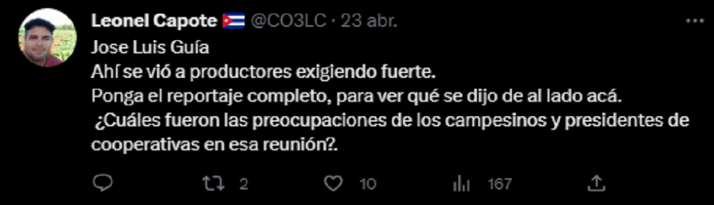 El campesino Leonel Capote, de la provincia de Artemisa, ha desmentido la labia del Vice Primer Ministro comunista, Jorge Luis Tapia Fonseca (quien trata de mostrarse interesado en la producción), diciéndole que sin combustible no se puede desarrollar la siembra.