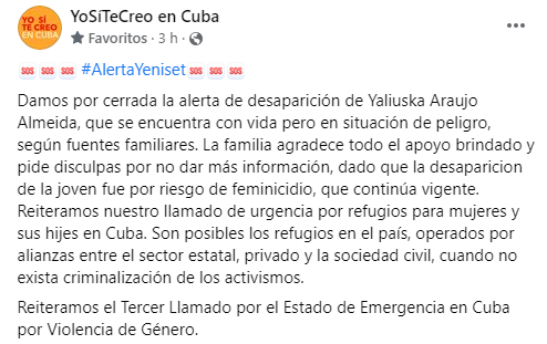 “Damos por cerrada la alerta de desaparición de Yaliuska Araujo Almeida, que se encuentra con vida pero en situación de peligro, según fuentes familiares. La familia agradece todo el apoyo brindado y pide disculpas por no dar más información, dado que la desaparición de la joven fue por riesgo de feminicidio, que continúa vigente”.
