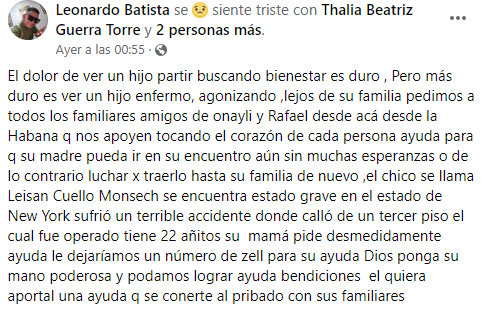“El dolor de ver a un hijo partir buscando bienestar es duro, pero más duro es ver a un hijo enfermo, agonizando, lejos de su familia. Pedimos a todos los familiares y amigos de Onaily, desde acá desde La Habana, que nos apoyen tocando el corazón de cada persona, para que su madre pueda ir en su encuentro”.
