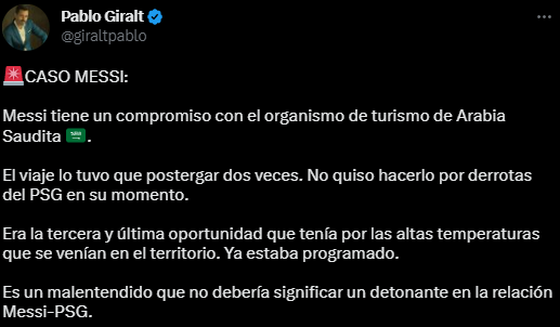 Ante esta situación, el periodista argentino, Pablo Giralt, explicó que Messi tenía un compromiso con una organización de turismo de Arabia Saudita y no podía postergarlo.