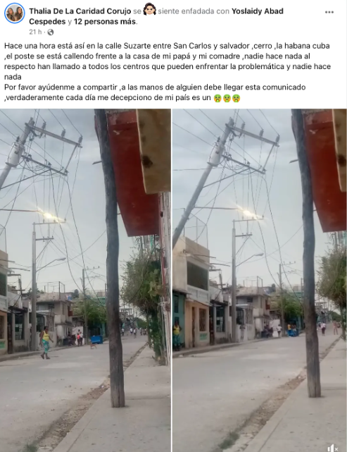 “Hace una hora está así en la calle Suzarte, entre San Carlos y Salvador, Cerro, La Habana. El poste se está cayendo frente a la casa de mi papá y mi comadre”, fueron las palabras de la denunciante.