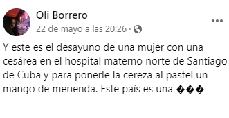 “Este es el desayuno de una mujer con una cesárea en el Hospital Materno Norte de Santiago de Cuba. Y para ponerle la cereza al pastel, un mango de merienda. Este país es una m*erda”, dijo la mujer al periodista Alberto Arego, luego de que este sacara a la luz una noticia similar.