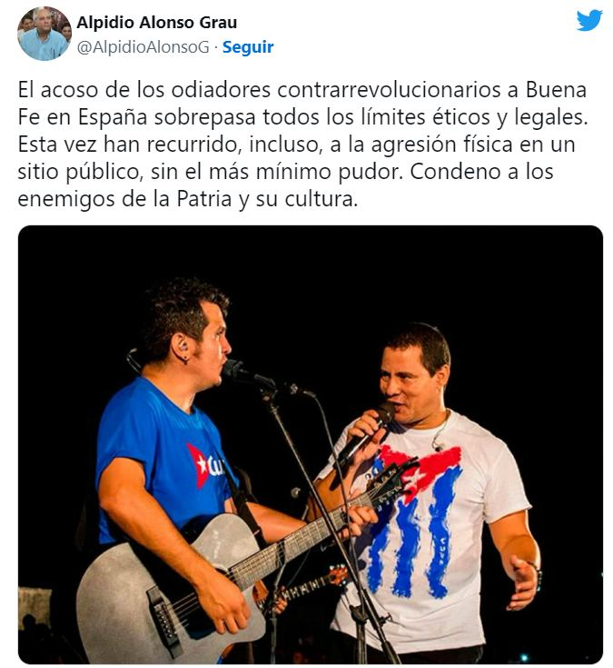 “El acoso de los odiadores contrarrevolucionarios a Buena Fe en España sobrepasa todos los límites éticos y legales. Esta vez han recurrido incluso a la agresión física en un sitio público, sin el más mínimo pudor. Condeno a los enemigos de la patria y su cultura”, fue el mensaje de Alpidio Alonso Grau en Twitter.