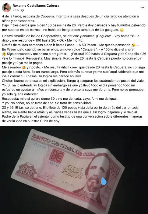 La cubana Roxanne Castellanos Cabrera, publicó en Facebook, las dificultades que tienen los cubanos para movilizarse en La Habana ante el alto costo del pasaje y la falta de la sensibilidad de algunos choferes.