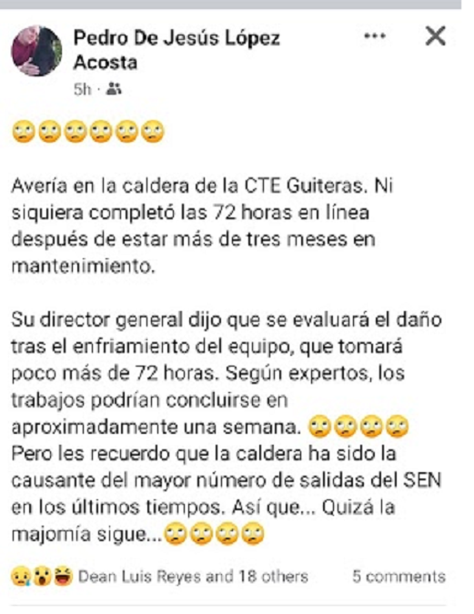 “Su director dijo que se evaluará el daño tras el enfriamiento del equipo, que tomara poco más de 72 horas. Según expertos los trabajos podrían incluirse en aproximadamente una semana. Pero les recuerdo que la caldera ha sido la causante del mayor número de salidas del SEN en los últimos tiempos. Así que… quizás la majomía sigue”, dice el mensaje del cubano