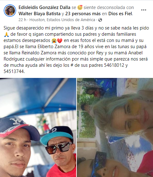 “Sigue desaparecido mi primo. Ya lleva 3 días y no se sabe nada. Les pido de favor que sigan compartiendo. Sus padres y demás familiares estamos desesperados. En esas fotos, él está con su mamá y su papá. Él se llama Eliberto Zamora, tiene 19 años, vive en Las Tunas”, dijo González.