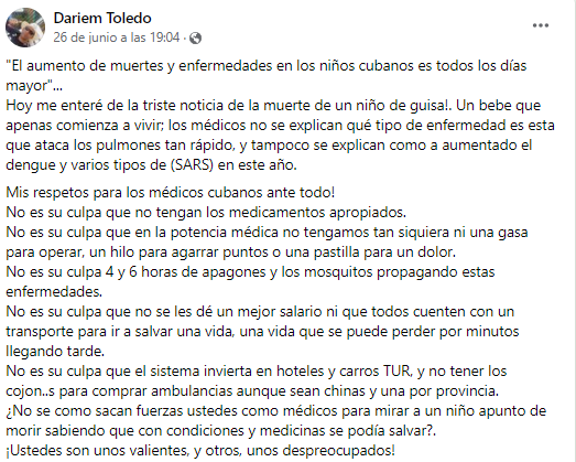 “Me enteré de la triste noticia de la muerte de un niño de Guisa, Granma. Un bebé que apenas comienza a vivir; los médicos no se explican qué tipo de enfermedad es esta que ataca los pulmones tan rápido, y tampoco se explican cómo ha aumentado el dengue y varios tipos de (SARS) en este año”, comenzó diciendo.