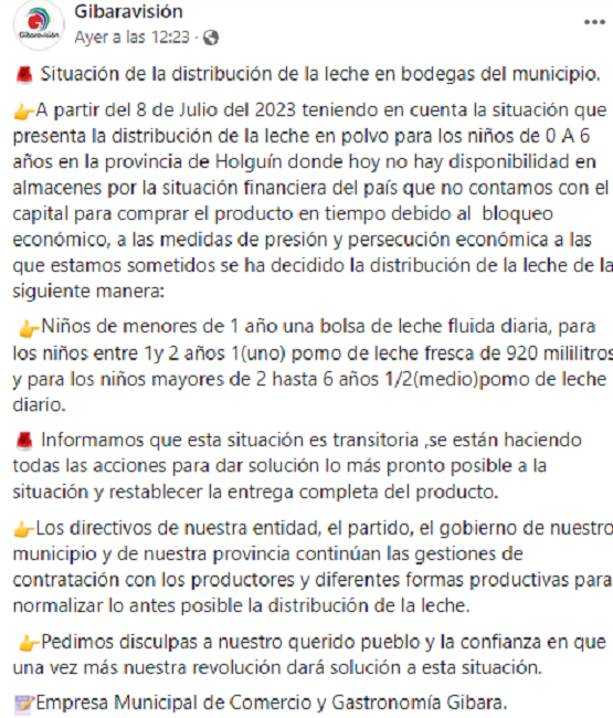 “Teniendo en cuenta la situación que presenta la distribución de la leche en polvo para los niños de 0 a 6 años en la provincia de Holguín donde no hay disponibilidad en almacenes por la situación financiera del país que no contamos con el capital para comprar el producto”, dice el mensaje del medio castrista Gibaravisión