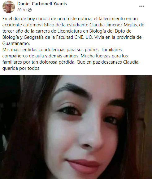 “En el día de hoy (miércoles) conocí de una triste noticia, el fallecimiento en un accidente automovilístico de la estudiante Claudia Jiménez Mejías, de tercer año de la carrera de Licenciatura en Biología del Dpto de Biología y Geografía de la Facultad CNE. UO. Vivía en la provincia de Guantánamo”, expresó en una publicación de Facebook.