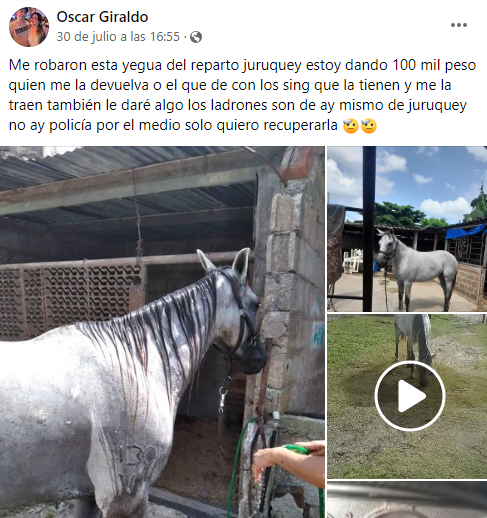 “Me robaron esta yegua del reparto Juruquey. Estoy dando 100 mil pesos a quien me la devuelva o el que dé con los sing… que la tienen y me la traen, también les daré algo. Los ladrones son de ahí mismo de Juruquey. No hay policía por el medio, solo quiero recuperarla”, aseguró el cochero cubano.