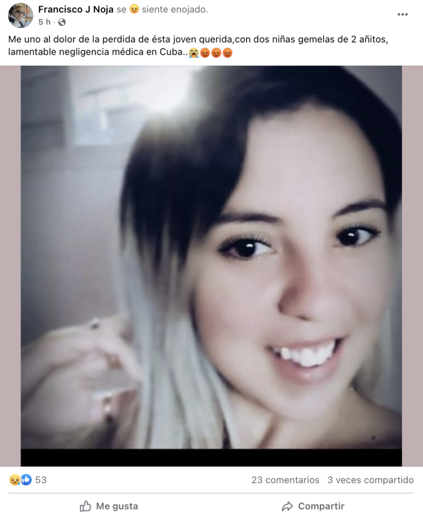 “Me uno al dolor de la perdida de esta joven querida con dos niñas gemelas de 2 añitos, lamentable negligencia médica en Cuba”, precisa la publicación.
