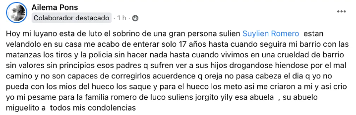 “Hoy mi Luyanó está de luto, al sobrino de una gran persona, Suylien Romero, están velándolo en su casa. Me acabo de enterar solo 17 años. ¿Hasta cuándo seguirá mi barrio con las matanzas, los tiros y la policía sin hacer nada? ¿Hasta cuando viviremos en una crueldad de barrio sin valores sin principios? Esos padres que sufren ver a sus hijos drogándose yéndose por el mal camino y no son capaces de corregirlos”, escribió una habitante de La Habana.