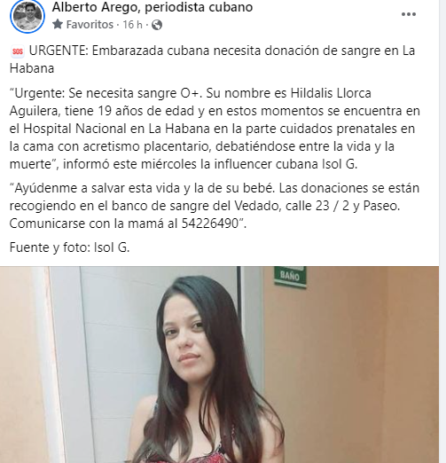 “Urgente: Se necesita sangre O+. Su nombre es Hildalis Llorca Aguilera, tiene 19 años de edad y en estos momentos se encuentra en el Hospital Nacional en La Habana en la parte de cuidados prenatales en la cama con acretismo placentario, debatiéndose entre la vida y la muerte”, informó la internauta Isol G.