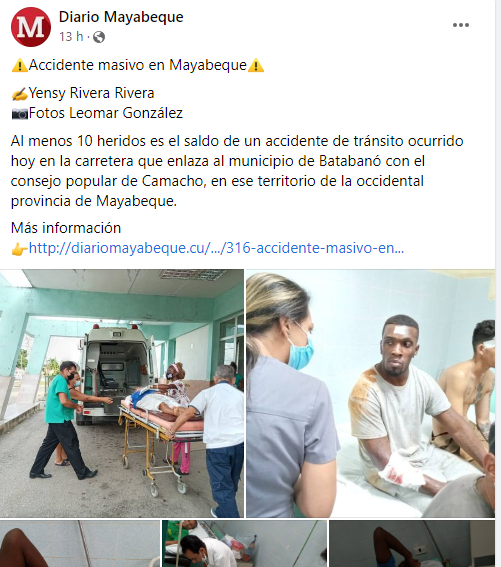 “Al menos 11 heridos es el saldo de un accidente de tránsito ocurrido hoy en la carretera que enlaza al municipio de Batabanó con el consejo popular de Camacho, en esa localidad de la occidental provincia de Mayabeque”, se lee en el reporte.