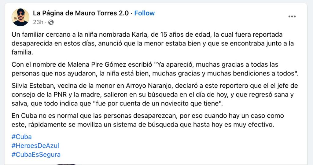 La muchacha, que se nombra Karla y tiene apenas 15 años, habría sido supuestamente encontrada en La Habana, según el post de un “familiar”.