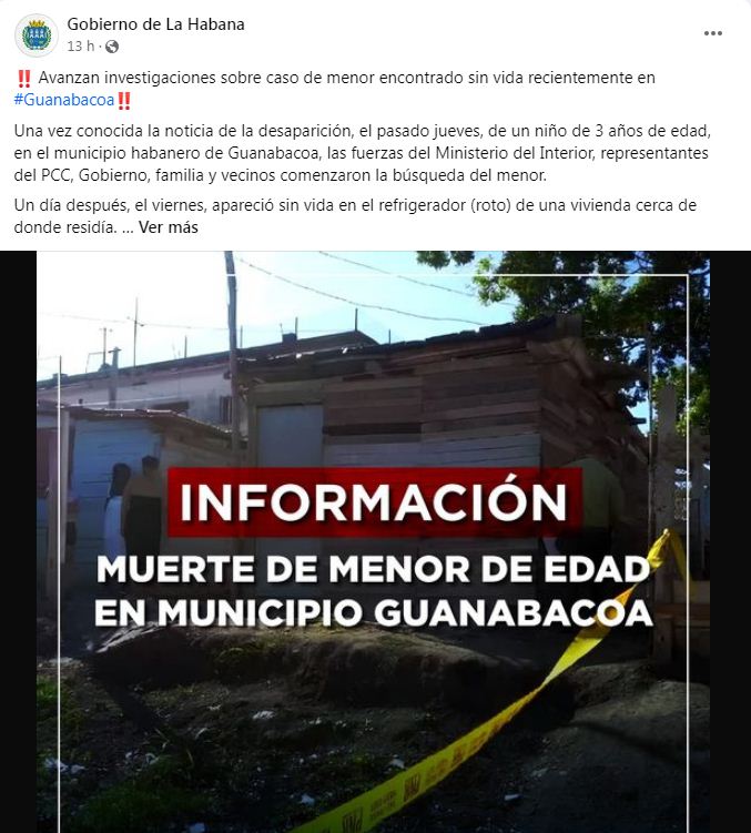 Desde la cuenta de Facebook del Gobierno de La Habana se publicó la versión oficial sobre el lamentable suceso ocurrido entre el 28 y 29 de septiembre en Guanabacoa, en el que murió un niño de tres años de edad.