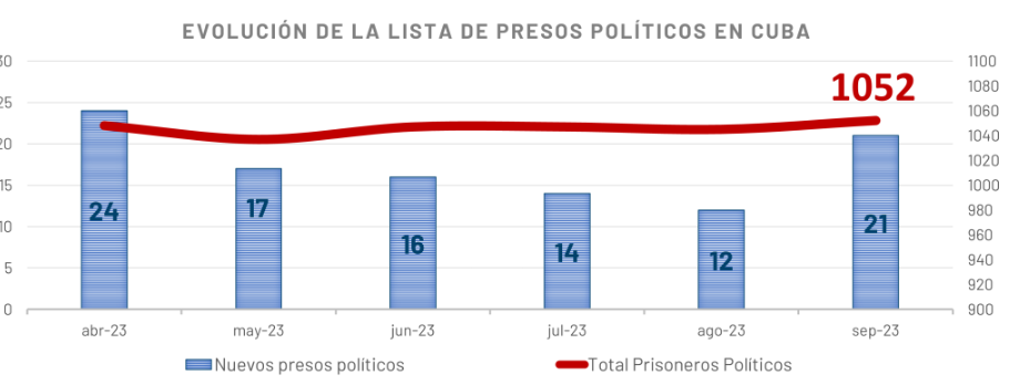Según el último reporte, correspondiente a septiembre, se añadieron 21 nuevos casos y se eliminaron 14, que ya habían cumplido sus condenas. Así, el número total de cubanos encarcelados por motivos políticos es de 1,052 en estos momentos; un número de personas que no cometieron ningún delito.