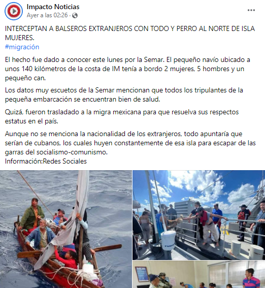 Entretanto, las autoridades mexicanas mencionaron que, afortunadamente, los balseros cubanos y el animal se encontraban en perfecto estado de salud.