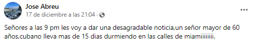 “Señores, les voy a dar una desagradable noticia, un señor mayor de 60 años, cubano, lleva más de 15 días durmiendo en las calles de Miami”, dijo José Oriol Abreu.
