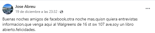 “Otra noche más. Quien quiera entrevistas, información, que venga aquí al Walgreens de 16 st sw 107 avenue, soy un libro abierto”, concluyó.