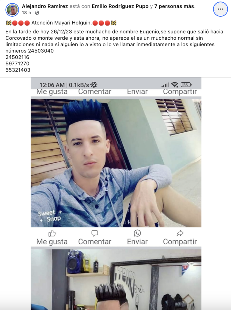 “Atención Mayarí, Holguín. En la tarde de hoy 26/12/23 este muchacho de nombre Eugenio, se supone que salió hacia Corcovado o monte verde y hasta ahora, no aparece, él es un muchacho normal sin limitaciones ni nada si alguien lo ha visto o lo ve llamar inmediatamente a los siguientes números 24503040 – 24502116 – 59771270 -55321403”, escribió el usuario de Facebook Alejandro Ramírez.