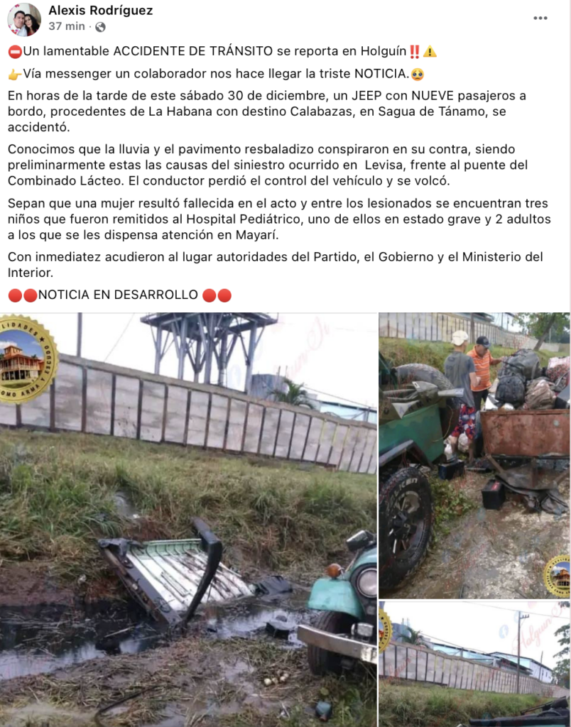 De igual manera, se informó sobre el fallecimiento de una mujer en el acto y que entre los lesionados están tres niños que fueron ingresados en el Hospital Pediátrico. “Uno de ellos en estado grave y 2 adultos a los que se les dispensa atención en Mayarí”, agregó el reporte.