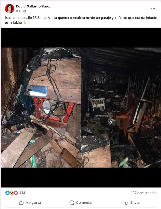 “Incendio en calle 15 Santa Marta quema por completo un garaje y lo único que queda intacto es la Biblia”, escribió.