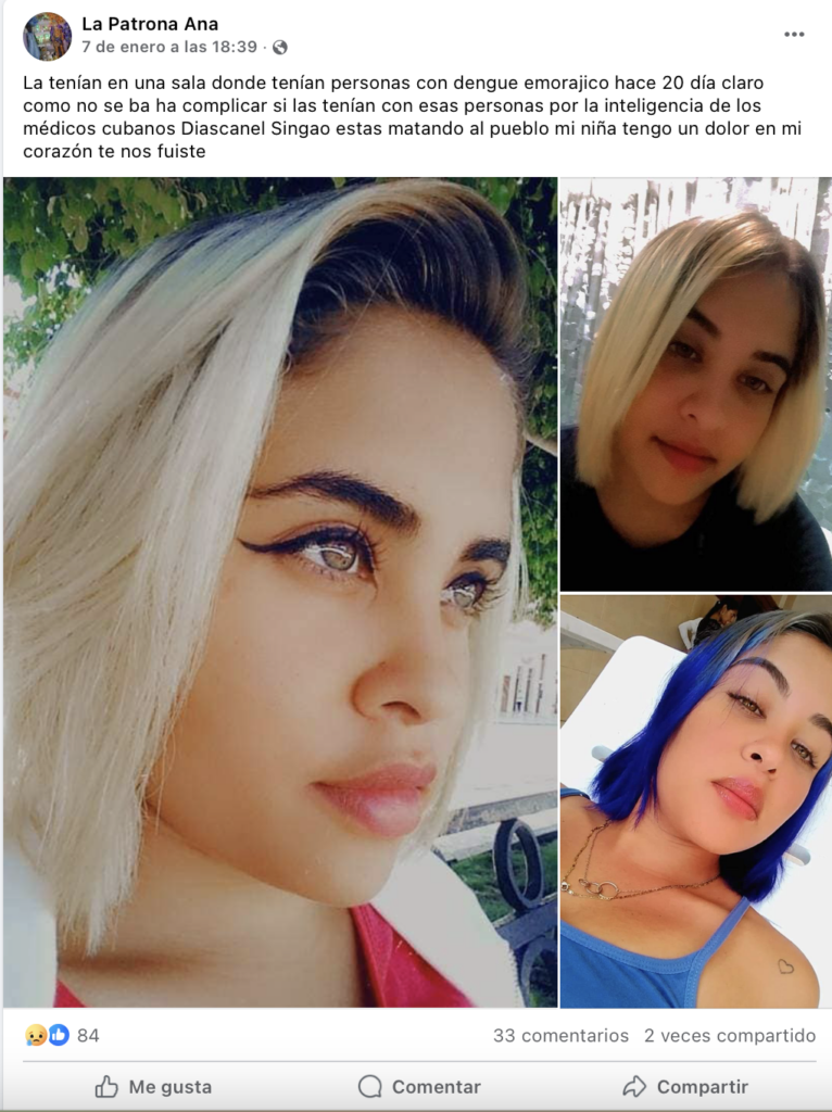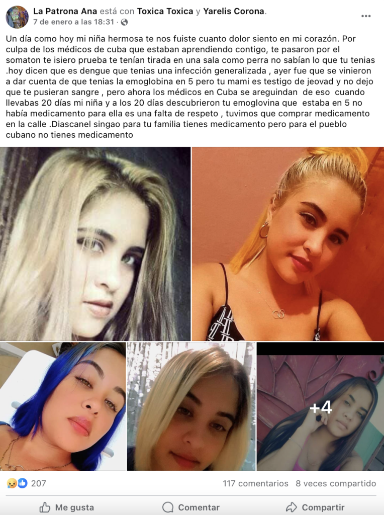 “Un día como hoy mi niña hermosa te nos fuiste cuanto dolor siento en mi corazón. Por culpa de los médicos de Cuba que estaban aprendiendo contigo, te pasaron por el somatón, te hicieron prueba, te tenían tirada en una sala como perra, no sabían lo que tú tenías. Hoy dicen que es dengue que tenías una infección generalizada, ayer fue que se vinieron a dar cuenta de que tenías la hemoglobina en cinco”, escribió la usuaria en Facebook llamada “La Patrona Ana”.