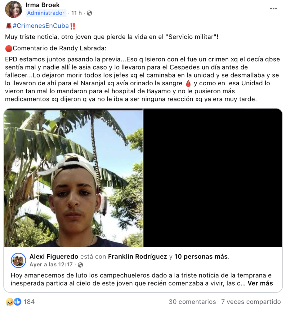 “Hoy amanecemos de luto los campechueleros dado a la triste noticia de la temprana e inesperada partida al cielo de este joven que recién comenzaba a vivir, las causas no las sabemos, todavía se encontraba pasando el servicio militar, por esta vía queremos trasmitir a sus familiares y personas más allegadas, que a partir de este momento nos unimos a su dolor que Dios lo acoja en su reino, prohibido olvidar”, escribió el internauta Alexi Figueredo en Facebook en un post en el que colocó la foto del muchacho.