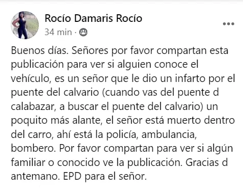 “Buenos días. Señores, por favor, compartan esta publicación para ver si alguien conoce el vehículo, es un señor que le dio un infarto por el puente del calvario (cuando vas del puente de calabazar, a buscar el puente del calvario) un poquito más adelante”, afirmó la mujer.