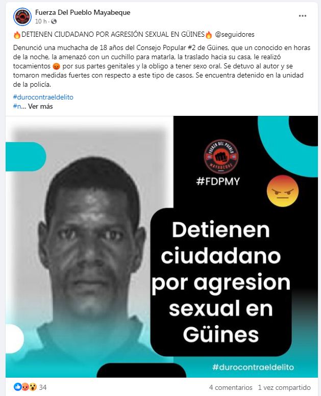 “Denunció una muchacha de 18 años del Consejo Popular #2 de Güines, que un conocido en horas de la noche, la amenazó con un cuchillo para matarla, la traslado hacia su casa, le realizó tocamientos por sus partes genitales y la obligo a tener sexo oral. Se detuvo al autor y se tomaron medidas fuertes con respecto a este tipo de casos. Se encuentra detenido en la unidad de la policía”, reza la publicación.