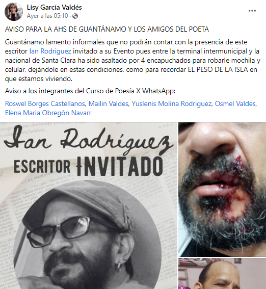 “Guantánamo, lamento informales que no podrán contar con la presencia de este escritor Ian Rodríguez, invitado a su evento, pues entre la terminal intermunicipal y la nacional de Santa Clara, ha sido asaltado por 4 encapuchados para robarle mochila y celular”, escribió García Valdés en Facebook.
