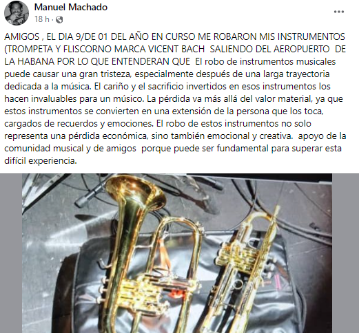 A través de un grupo de Facebook de trompetistas cubanos, Machado expresó su dolor por el robo.