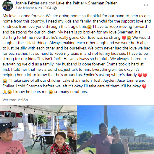 “Mi amor se ha ido para siempre. Nos vamos a casa muy agradecidos porque nuestra banda nos ayudó a regresar a casa de este país. Necesito a mis hijos y a mi familia. Agradecido por el apoyo, amor y amabilidad de todos durante este momento trágico, tengo que seguir adelante y ser fuerte por nuestros hijos”.