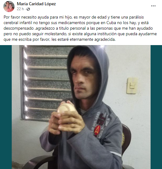 “Por favor necesito ayuda para mi hijo, es mayor de edad y tiene una parálisis cerebral infantil, no tengo sus medicamentos porque en Cuba no los hay, y está descompensado”, escribió la madre en su publicación.