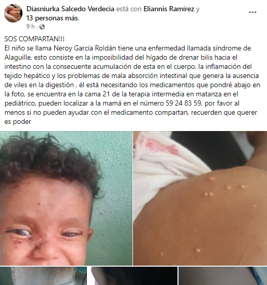 A través de las redes sociales, circuló la petición de ayuda urgente para un niño cubano residente en la provincia de Matanzas, quien presenta una enfermedad en el hígado y, en consecuencia, necesita varios medicamentos que en la isla son difíciles de conseguir.