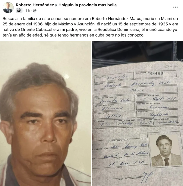 “Busco a la familia de este señor, su nombre era Roberto Hernández Matos, murió en Miami un 25 de enero del 1986, hijo de Máximo y Asunción; él nació un 15 de septiembre del 1935 y era nativo del oriente de Cuba”.