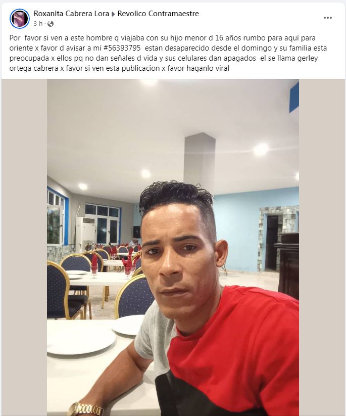 “Por favor si ven a este hombre que viajaba con su hijo menor de 16 años rumbo para aquí, para oriente. Por favor avisar a mi #56393795 están desaparecidos desde el domingo y su familia está preocupada por ellos, porque no dan señales de vida y sus celulares dan apagados. Él se llama Gerley Ortega Cabrera. Por favor si ven esta publicación por favor háganlo viral”, reza la publicación.
