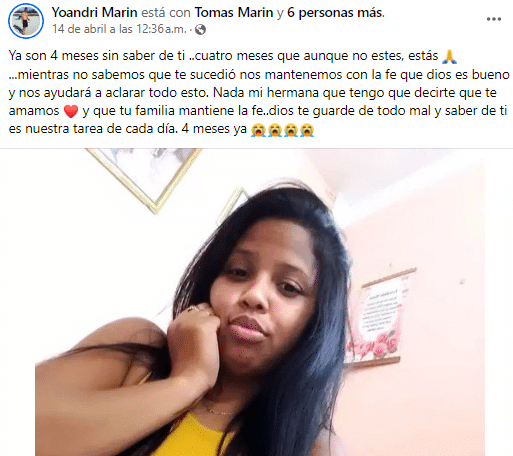 “Ya son cuatro meses sin saber de ti… cuatro meses que, aunque no estés, estás… mientras no sabemos qué te sucedió, nos mantenemos con la fe que Dios es bueno y nos ayudará a aclarar todo esto. Nada mi hermana que tengo que decirte que te amamos y que tu familia mantiene la fe… Dios te guarde de todo mal y saber de ti es nuestra tarea de cada día. Cuatro meses ya”, expresó su hermano, Yoandri Marín, en una publicación de Facebook.