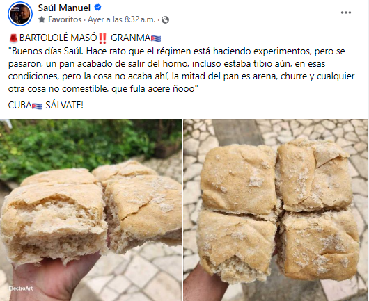 “Hace rato que el régimen está haciendo experimentos, pero se pasaron, un pan acabado de salir del horno, incluso estaba tibio aún, en esas condiciones, pero la cosa no acaba ahí, la mitad del pan es arena, churre y cualquier otra cosa no comestible”, se lee en la publicación.