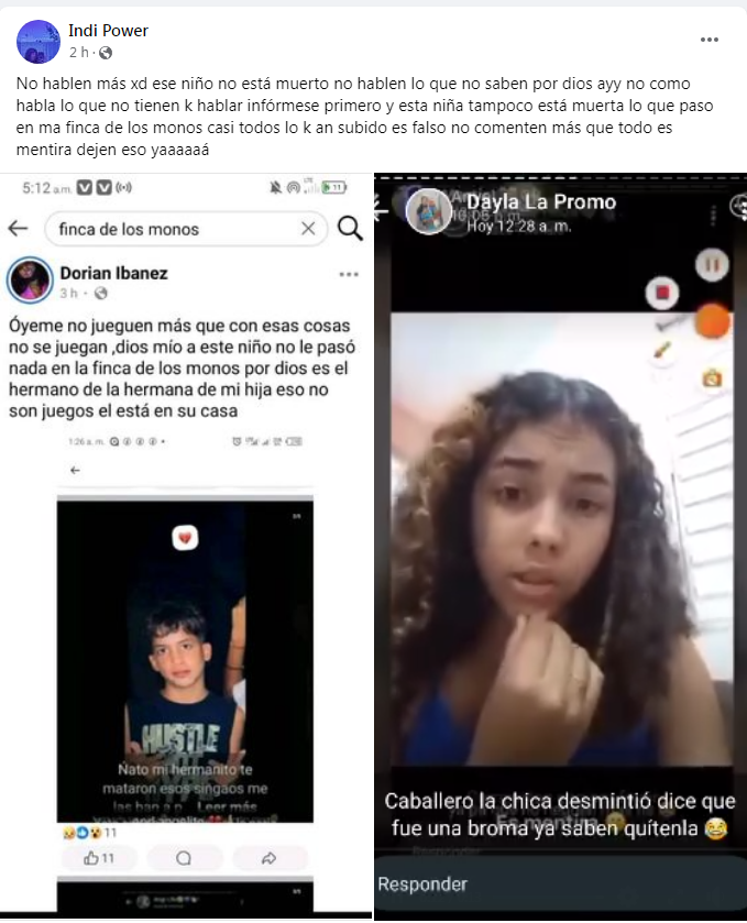Varias personas han revelado imágenes de personas que presuntamente fallecieron en la Finca de los Monos, en especial de menores de edad, sin embargo, familiares y amigos lo han desmentido, e incluso, una joven grabó un video para decir que ella ni siquiera estaba en el lugar, por lo que pidió que dejaran de sembar el pánico con dicha calumnia.