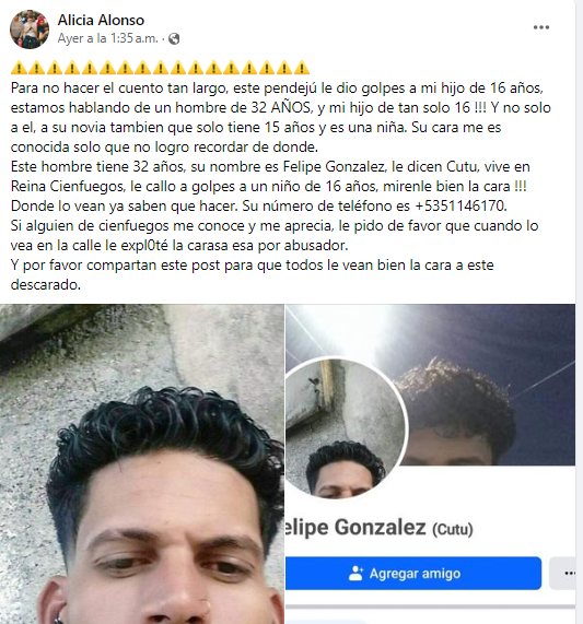 “Donde lo vean, ya saben qué hacer. Su número de teléfono es +5351146170. Si alguien de Cienfuegos me conoce y me aprecia, le pido de favor que cuando lo vea en la calle le explote la cara esa por abusador”.