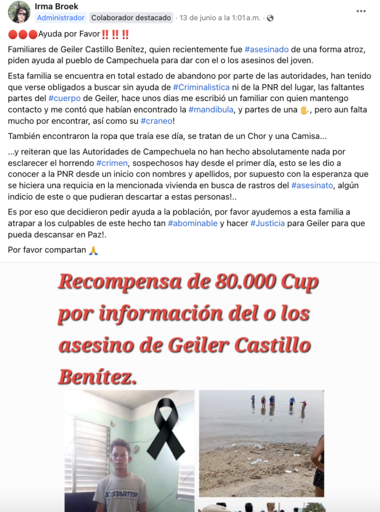 A través de las redes sociales, los familiares de Geiler Castillo Benítez, un joven cubano que fue recientemente asesinado en la isla, están ofreciendo una recompensa para quien de información sobre los autores del crimen.