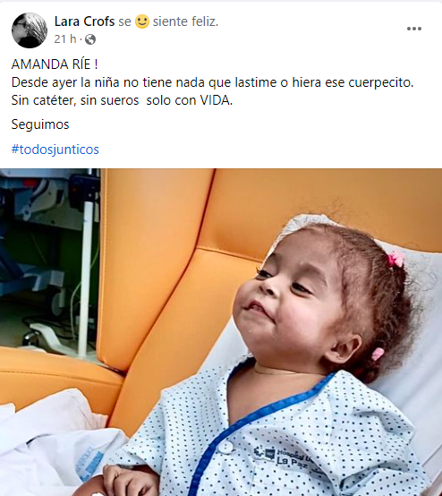 “Amanda ríe. Desde ayer la niña no tiene nada que lastime o hiera ese cuerpecito. Sin catéter, sin sueros, solo con vida”, expresó la activista en una publicación acompañada con una fotografía de la pequeña, con un semblante muy distinto al que tenía en Cuba.