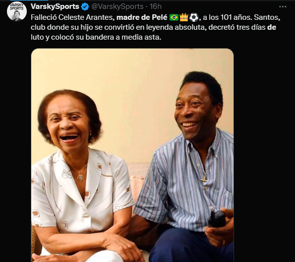 En las últimas horas, fue reportado el fallecimiento de Celeste Arantes, madre del icónico futbolista brasileño Pelé, ocurrido este viernes 21 de junio en Santos, costa de São Paulo, Brasil.